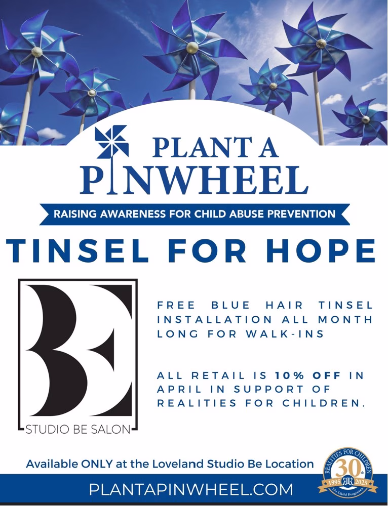 April is Child Abuse Prevention Month, and Studio Be Salon Loveland is proud to stand with Realities For Children in supporting local children affected by abuse and neglect. This April, we’re raising awareness with our Tinsel for Hope campaign — and you’re invited to join us.