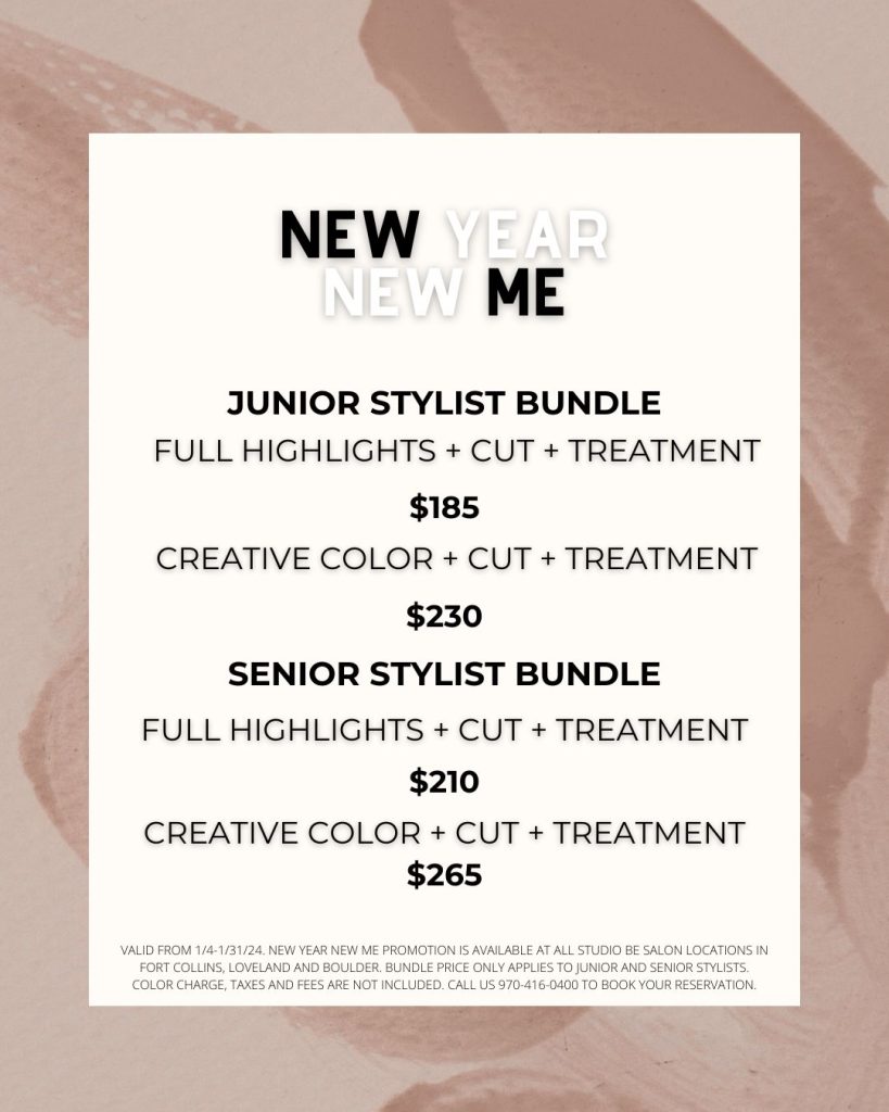 New Year New Me bundle is only valid from 1/4-1/31/2024. Available at all Studio Be Salon locations in Fort Collins, Loveland, and Boulder. Bundle price only applies to junior and senior stylists. Color charge, taxes, and fees are not included.